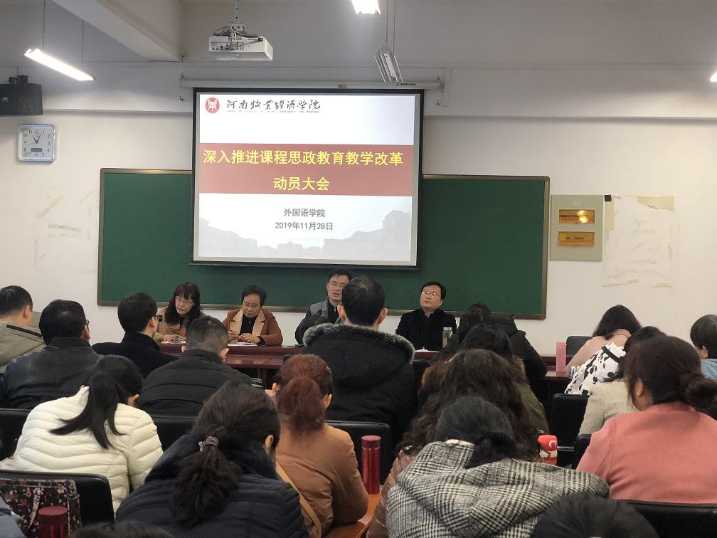 11月28日下午,ok138cn太阳集团古天乐召开深入推进课程思政教育教学改革动员大会暨期中教学检查总结会,学院领导及全体教工参加会议,会议由院长陈延潼主持。
