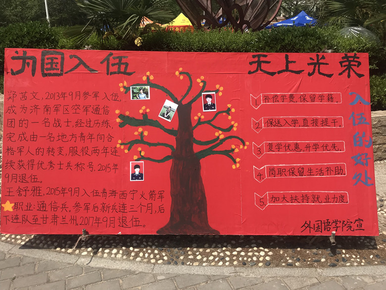 为了让同学们更好的了解参军入伍的政策,我院绘制参军入伍展板,展示参军入伍的流程以及我院退伍学生的风采。