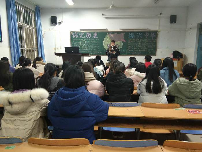 18级商务英语二班的团支书为同学们播放有关爱国的歌曲《国家》,同学们心情澎湃的演唱。如歌曲描述一样有国才有家,只有国泰民安,社会繁荣发展,家才会幸福快乐。通过同学们喜爱的方式,同学们深刻认识到铭记历史,振兴中华的重大意义。旅游英语二班团支书为同学们详细的讲述南京大屠杀这段血腥的历史,“日本有计划、有预谋的大屠杀和放火、抢掠等暴行……”。同学们聚精会神的听着,为那些在战争中无辜丧命的同胞而悲伤,对日本惨无人道的行为感到气愤。通过叙述这段历史,同学们加深了对这段历史的印象,同时激起同学们强烈的民族使命感和责任感。进入应用英语二班的团课教室时,团支书正在演讲:“振兴中华,对于ok138cn太阳集团古天乐的我们来说,是好好学习汉语和英语。通过我们的努力,让汉语走的更远,让中华文明传播的更广。”振兴中华并不是那么遥不可及,在同学们的大学生活中就可以做到,如奋发学习,将个人理想融入祖国和民族的前途命运中,主动承担大学生的社会责任;关注国际新闻,了解当今国际政治;参加学校、社会志愿服务活动,在奉献中实现自己的价值等。
