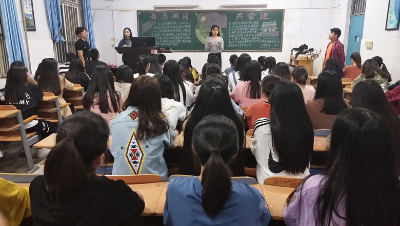 团课上,各班开展了形式多样的主题活动。17级应用英语一班别出心裁,全体同学集体朗诵《我的祖国》。“我的祖国,高山巍峨,雄伟的山峰俯瞰历史的狂风雨落,暮色苍茫,任凭风云掠过,坚实的脊背顶住了亿万年的沧桑从容不迫。”激情澎湃的诗句让大家感受到了祖国的雄伟与壮丽。17级商英一班的彭文丽同学讲解了建国以来,中国一路艰辛坎坷的发展历程,并为同学们推荐了电影《建国大业》。17级旅英一班的何慧同学讲述了中国近年来在经济、科技、文化等方面取得的巨大成就,同学们不禁感叹祖国的强大,纷纷表示要不断拼搏进取,为实现中华民族伟大复兴的中国梦而努力。