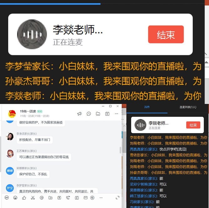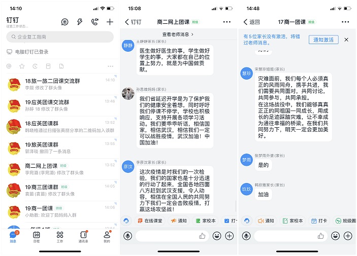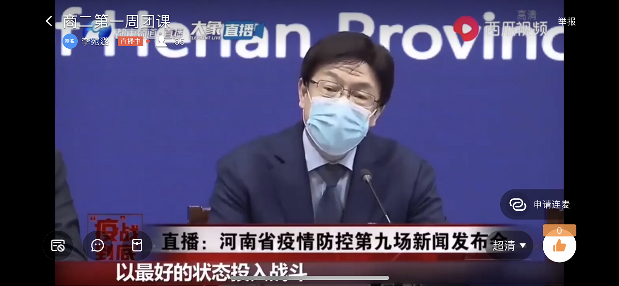 团课上,各班团支书利用钉钉直播软件,首先组织大家观看学习了河南省教育厅党组书记、厅长郑邦山在“河南省新型冠状病毒感染的肺炎疫情防控工作”第九场新闻发布会上的讲话。19商英01班团支书张雨微谈到“在聆听了郑厅长的发言后,感受颇深,心潮澎湃,懂得了打赢这场“战争”的重要性。我们共青团员要听从学校安排,保持联络畅通,不提前返校,每日积极汇报健康情况,不听谣不传谣,为打赢这场防疫战贡献力量。”商务英语二班,主持人精心制作了PPT为大家讲述了身边人在抗击疫情中的感人故事。同时,还积极展开线上互动,同学们争先恐后回答相关问题,活跃的氛围感染着每个同学。应用英语班主要以图文形式,直观的让大家学习在新冠病毒面前应该如何做、怎样做得更好。旅游英语班采用播放视频的方式,让同学们深切感受到了万众一心、攻坚克难的“中国力量”。副书记李燚,辅导员田春霞、刘萌、李昀老师深入各团支部,与团员青年们一起学习防疫知识,并引导团员青年遵守各项防控规定,督促大家踏实勤奋抓好学业。