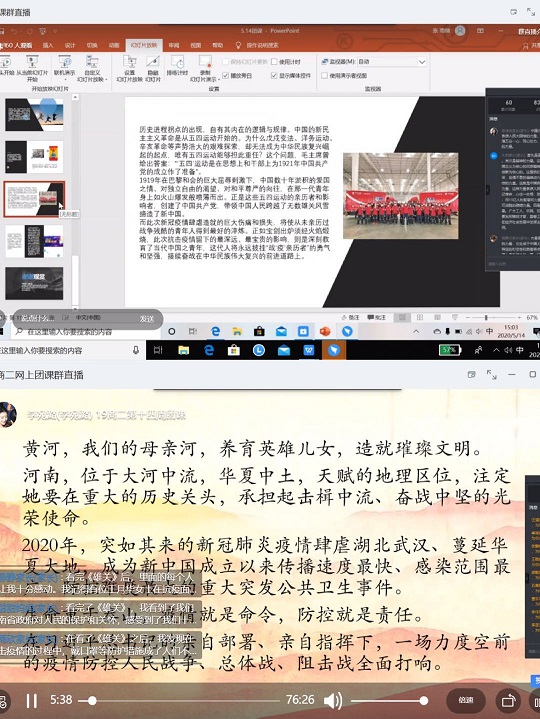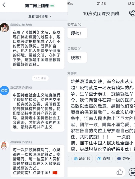 团课进行过程中同学们纷纷发表自己的看法,并在讨论中引发对更多抗疫英雄、中原优秀儿女的故事的讲述。一个个感人至深的故事、一幅幅中原儿女担当、奋斗的画面让同学们心潮澎湃。19商英二班李宛潞说到:“在我们的身边也有很多这样的抗疫英雄,他们可能是我们的家人、朋友亦或者是我们自己,当他们投身这场突出起来的战斗,他们的心里只要一个想法:我们要做些什么,尽自己的力量去做出努力。他们是许多个你我的一个,平凡的生活着却又伟大的奋斗着。”同学们分享了很多的抗疫者的故事,故事里不仅有一个个让人敬仰的的战“疫”者,还有同学们的梦想和信念。