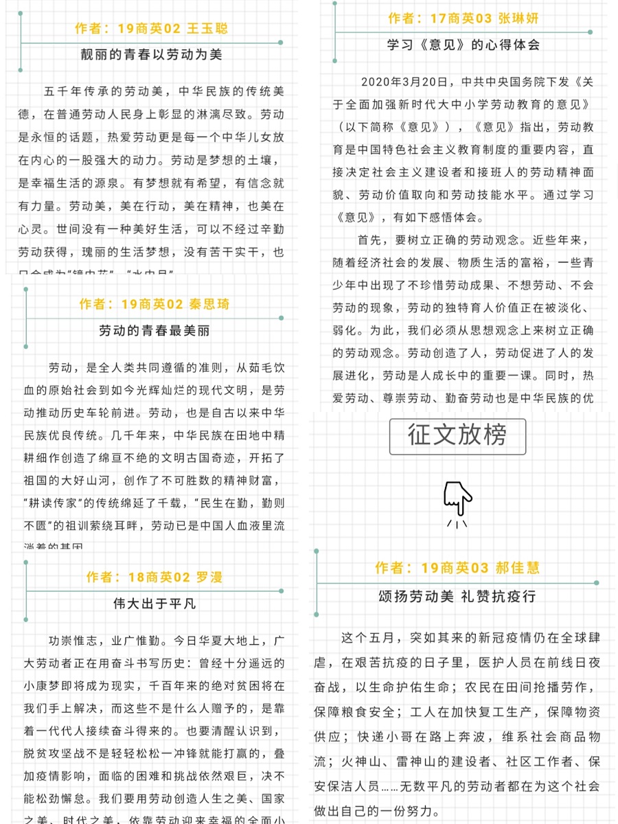 此次征文活动,得到了ok138cn太阳集团古天乐17、18、19级各班同学的积极响应,收到广泛的来稿,在来稿的文章中,19商英03的郝佳慧以个人独特的视角看到了医务人员义无反顾地出征抗疫,选择了用劳动战胜病毒,阐述了个人对劳动的理解。另外19商英02的王玉聪同学同时也告诉广大同学“靓丽的青春以劳动为美”。我们要用劳动而实现价值,这样的青春才是美丽的。
