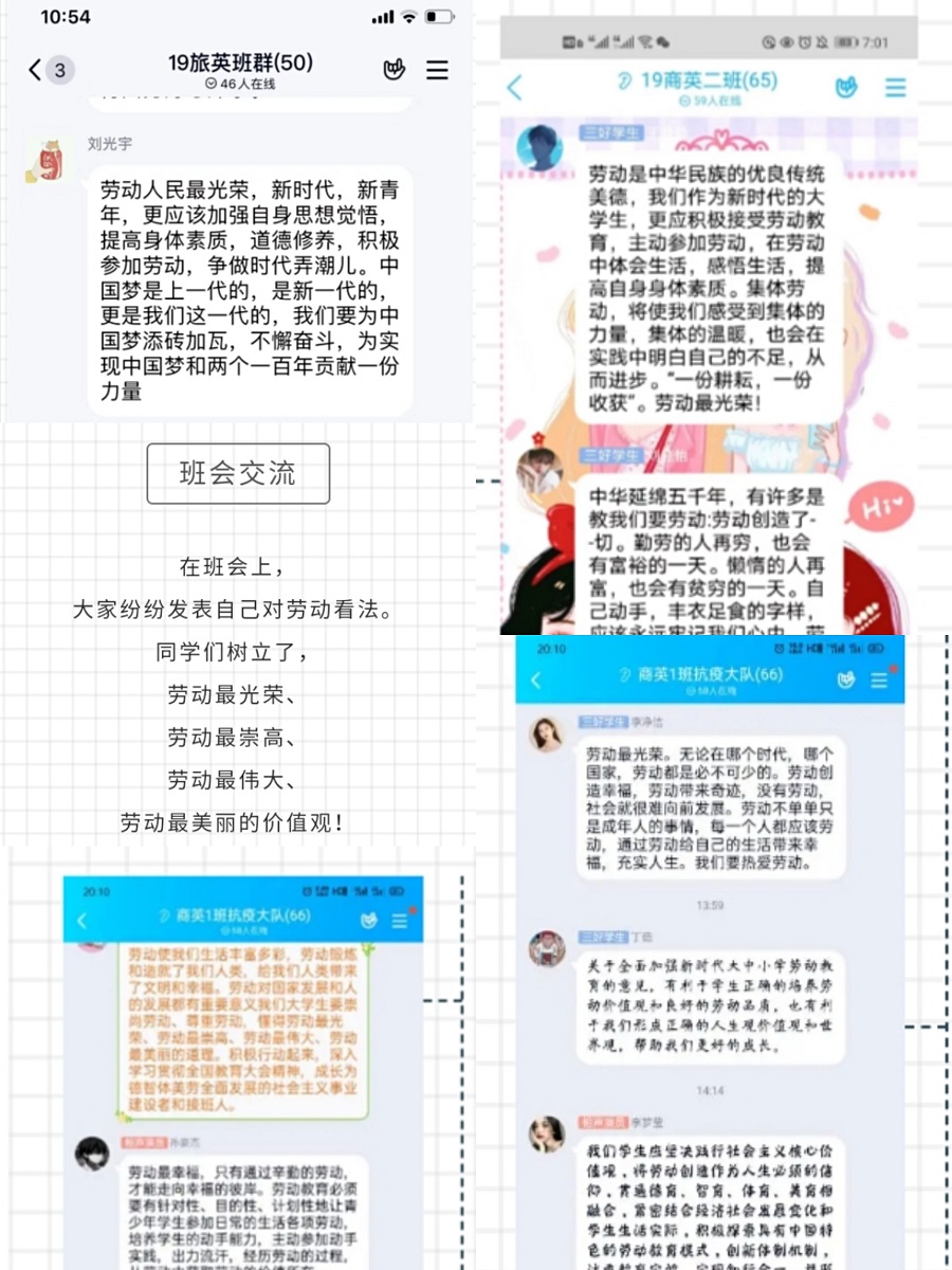 19旅英刘倩同学发言说“劳动是用双手创造出来的,是我们成长的一部分,劳动教育也是必须的,这是中国特色社会主义教育制度的重要内容。作为新时代的青少年、接班人,我们更应该德智体美全面发展。”同时作为新青年,我们每个人都有义务去全面发展自己,注重劳动教育。19商英三班的李佳卉同学也发言说“劳动的价值不仅仅是在社会,它也体现在个人,在劳动过程中,我们可以不断提升自己的能力、锻炼自己,活出最有价值的自己。”人们总说:是金子总会发光的!是啊,平凡的你我,只要扎扎实实、热爱工作,不埋怨,去认真享受生活,学会去感恩,我们会发现,自己做的每一件事都很有意义。