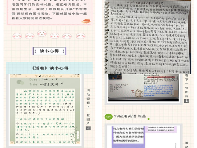 各班广泛积极宣传,同学们参与程度高,活动效果良好。在活动期间,同学们每天撰写读书心得和摘抄笔记,并在朋友圈进行拍照打卡。各班组建读书活动分享群,参与成员每天将朋友圈截图和手写笔记在群内进行分享,交流自己的读书心得和收获。假期期间,学院共收到读书文字、视频和音频作品近百篇,优秀作品在学院微信公众号上进行了推送,为同学们提供了交流学习和自我展示的平台。