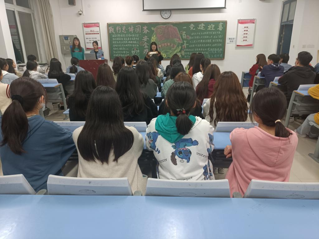 团课上,各班同学积极发言,气氛活跃,展现了良好的学习风貌。团课伊始,商务英语一班班委就带领同学们回顾了党百年来所经历的风风雨雨,通过影像资料了解了先辈们为造就今天的幸福生活所遭受的磨难;商务英语二班则结合当下国际形势和我国相关法律法规向同学们解讲解了总体国家安全意识的含义及其现实意义,让同学们深刻领会到了维护国家安全的重要性。