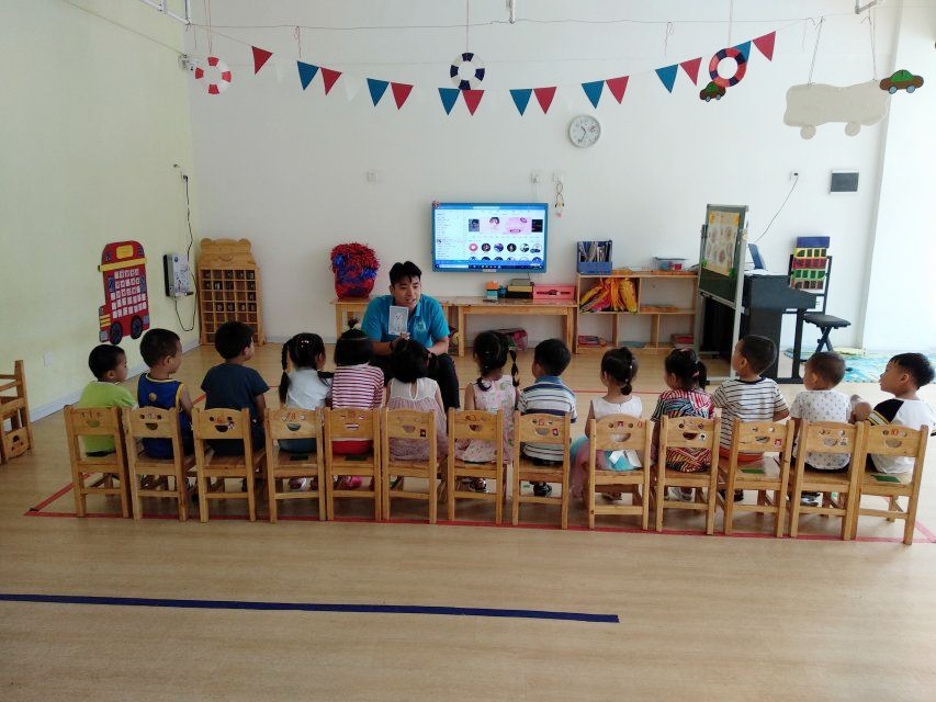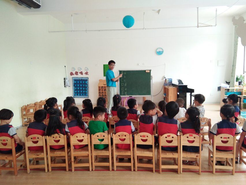 来到幼儿园后,幼儿园老师首先对志愿者们进行分组,每组分别对应不同年龄的班级:小班、中班和大班。根据小朋友年级的差异,志愿者们采用了不同的教学内容和方法。对于小班的小朋友们,志愿者从最基础的英文字母入手,通过图形联想的方法让孩子们认识英文字母,如字母A像一个尖尖的金字塔,字母B像一只大耳朵等等。并带领小朋友大声朗读记住它们的发音,播放字母歌激发孩子们的兴趣,课堂氛围生动有趣。