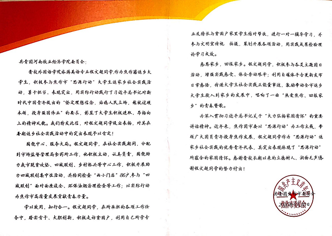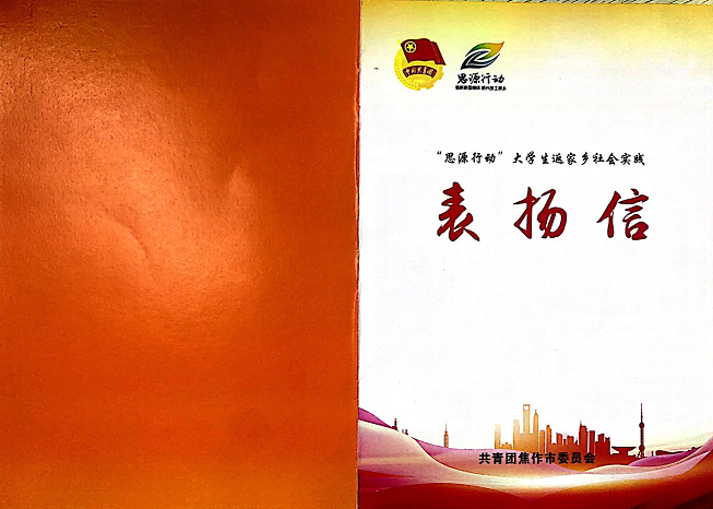 近日,共青团焦作市委员会发来表扬信,对ok138cn太阳集团古天乐2019级旅游英语专业学生程文超在焦作市“思源行动”大学生返家乡社会实践活动中的突出表现予以表扬和感谢。