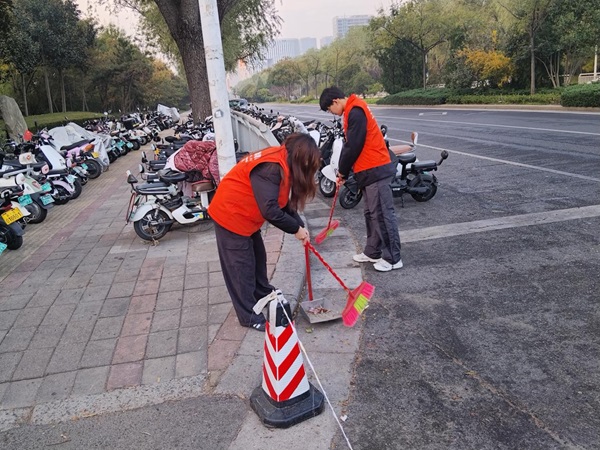 我院积极响应学校共创文明校园号召,开展“清洁校园,拥抱绿色”卫生清扫志愿服务活动。大家于学校西门外扫清尘埃,有序积极打扫校园门口前的落叶与垃圾,他们辛勤的身影是校园靓丽的风景线,为出入校园的师生们带来了美好的心情,营造了美丽的校园环境。同时,志愿者们手拿拖把,扫帚等清洁工具深入校区角落及宿舍,对宿舍内部、校园小巷垃圾、杂物等进行了打扫,道路旁横七竖八的自行车,也在志愿者们的共同努力下,整齐有序地摆放,共同营造出建设和谐校园环境的美好愿景。
