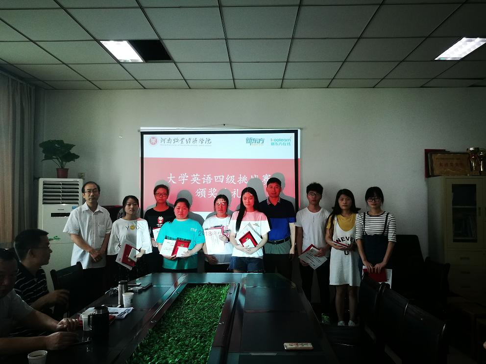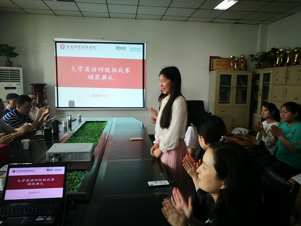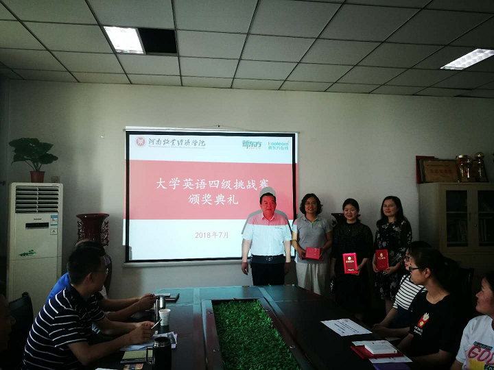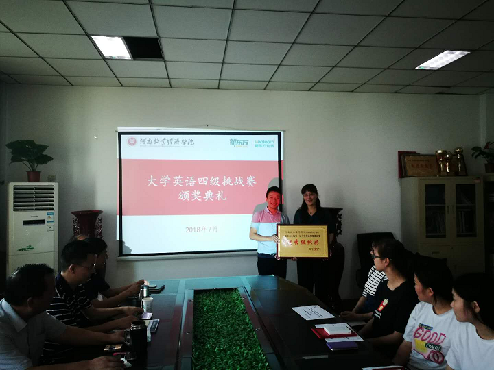7月5日上午,由新东方在线支持举办的“大学英语四级挑战赛”活动颁奖仪式在ok138cn太阳集团古天乐会议室举行。ok138cn太阳集团古天乐领导班子、“新东方在线”高校运营管理部助理大区总监钱硕、“大学英语四级挑战赛”活动优秀指导教师和获奖学生参加颁奖仪式,ok138cn太阳集团古天乐副院长马媛媛主持颁奖仪式。