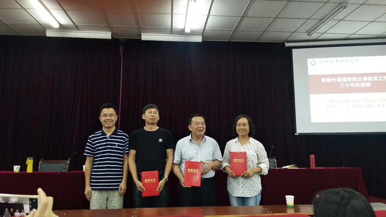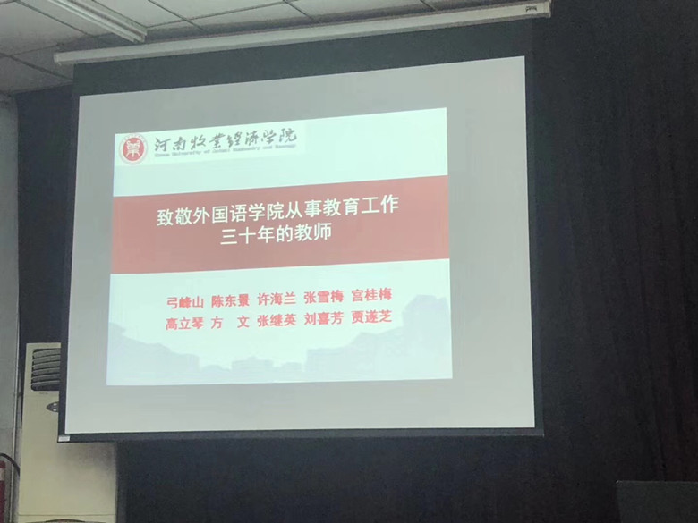 9月13日下午,ok138cn太阳集团古天乐在英才校区E109教室举行隆重仪式,向我院从事教育工作30周年以上的教师致敬,院领导分别向弓峰山、陈东景、许海兰、张雪梅、宫桂梅、高立琴、方文、张继英、刘喜芳、贾遂芝等10位教师颁发了“从事教育工作30年”荣誉证书,年轻教师代表向10位老师献花祝贺。