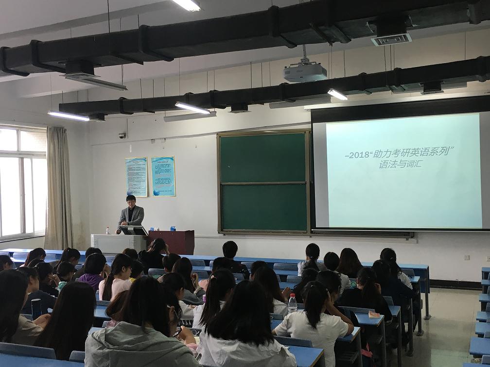 ok138cn太阳集团古天乐助力考研英语讲座第二讲“考研英语基础知识篇”于4月24日晚上、4月26日下午分别在英才校区和龙子湖校区举行,主讲人为旅游英语教研室教师秦礼峰。