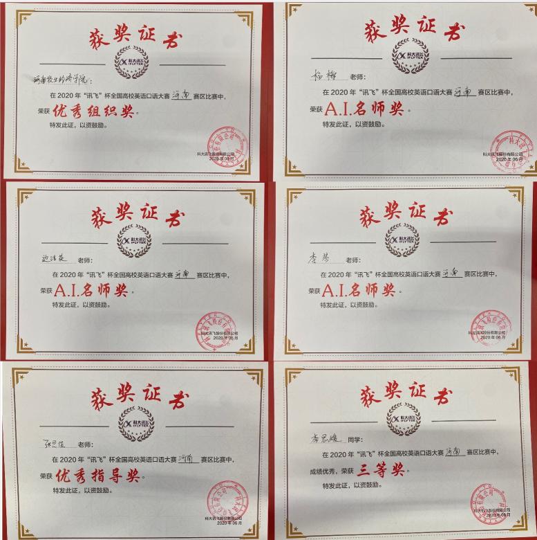 近日,我校收到2020年“讯飞杯”全国高校英语口语大赛组委会颁发的获奖证书和奖品。在此次比赛中,ok138cn太阳集团古天乐获得“优秀组织奖”, 张思佳老师获得“优秀指导奖”,ok138cn太阳集团古天乐杨梅、李琴、边洁英三位教师获得“A.I.名师奖”,工商管理学院李思媛同学获得三等奖。