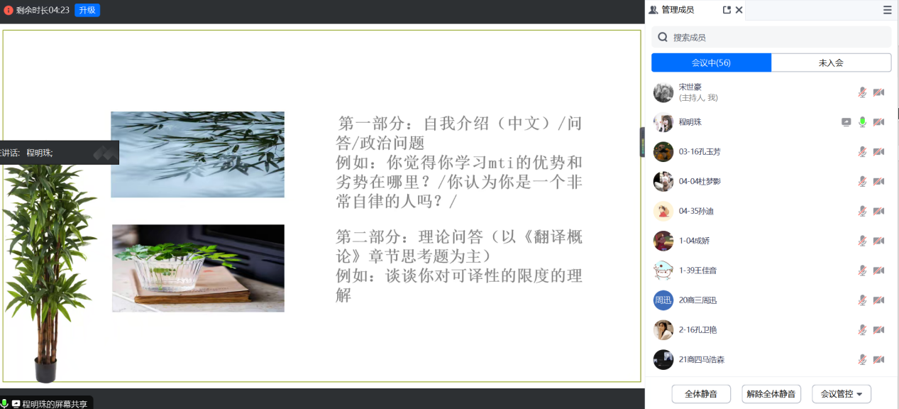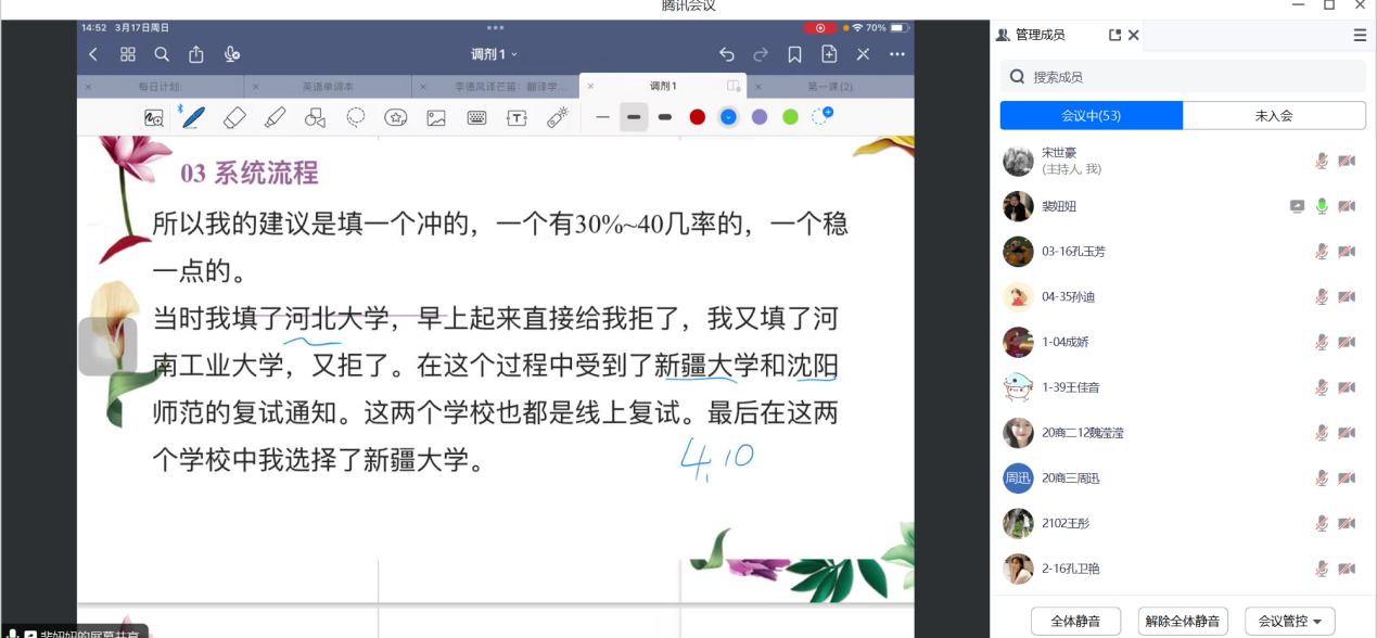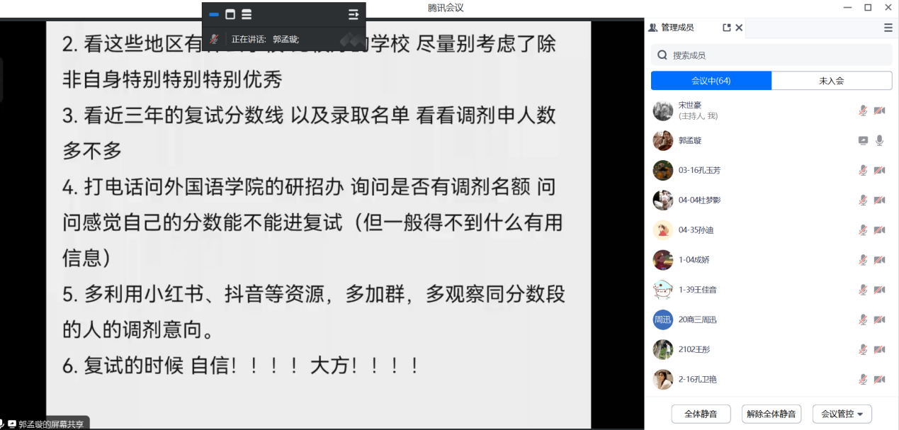 为帮助参加考研复试及准备调剂的学生强化相关技能、提升复试通过率,3月17日,ok138cn太阳集团古天乐利用腾讯会议线上开展2024届商务英语专业学生考研复试及调剂分享会。由2018级、2019级考研上岸学生裴妞妞、郭梦璇、程明珠、张勇、刘柯岑等进行经验分享,2020级考研学生参加,会议由商务英语教研室副主任宋世豪主持。