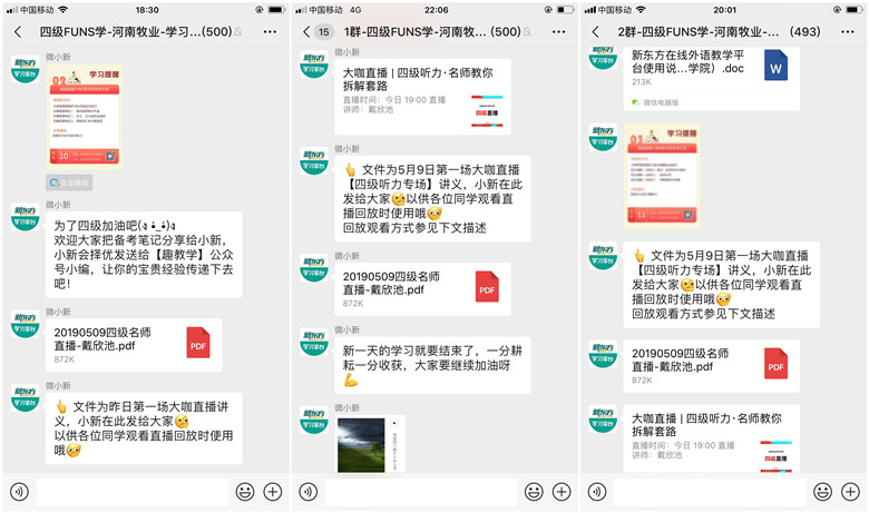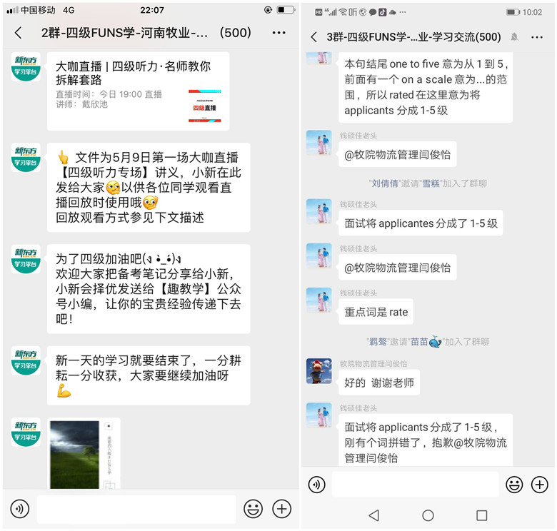 新东方教育科技集团在全国选取了两所高校进行“28天伴学计划”试点,我校是其中之一。自活动开展以来,得到了同学们的积极响应,如今已开通四级群是4个,六级群1个,两千五百余名学生加入。微信群定时发送学习提醒,并提供学习资料,ok138cn太阳集团古天乐的教师也加入到各个学习群,与新东方教育科技集团的技术人员一起为学生解决学习中遇到的困难。参与学生通过新东方在线外语教学平台APP/PC线上进行视频课程、试题训练、名师直播等学习。同学们纷纷表示这种“伴学”方式有的放矢,针对性强,有效解决了学习中的问题,同时免费为同学们开通网络英语四六级辅导课程,既拓展了同学们学习的空间,拓宽了同学们复习的渠道,又减轻了同学们的经济压力。