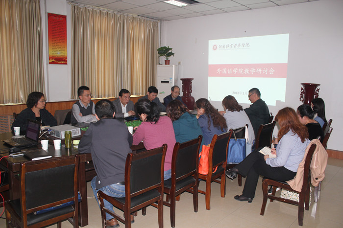 院长陈延潼结合个人学习心得,对学校教学工作会议精神进行了解读,并结合我院的实际情况就教育教学工作谈了自己的想法,指出一要树立规范意识,我们的各项教学工作从现在开始要以迎评促建为出发点和落脚点,各项工作都要注重规范,按照本科合格评估的要求认真开展。二要强化规矩意识,我院正处于融合起步阶段,教职员工90余人,人员多,工作头绪多,既要承担全校公共外语教学工作,又要做好外语专业建设,作为教研室主任要主动作为,主动思考,做好院领导与教师之间的桥梁和纽带,确保各项教学工作稳定有序开展。三要强化责任意识,要以2018版人才培养方案修订为契机,大学英语教学要继续优化“2+X”的大学英语课程体系建设,适时推进分层分类教学,要以大学英语四六级和考研英语为抓手,合理优化相关后续课程,不断提升大学英语教学质量;商务英语本科专业要紧贴《普通高等学校本科专业类教学质量国家标准》,以学位评估为指引,强化产教融合、校企合作,贯彻“立足外国语、花开牧工商”的理念,在牧工商一体化产业链中找到专业的价值所在,凝练专业特色;专科专业要有危机意识,要主动转型,挖掘潜力,对接产业,寻求新的本科专业的增长点。四要树立规则意识,融合是基础、发展是心声,要用制度引导工作的开展,用制度优化工作的氛围,用制度营造干事创业的环境,大家要牢固树立规则意识,以身作则,以身示范,为ok138cn太阳集团古天乐的发展做出应有的贡献。