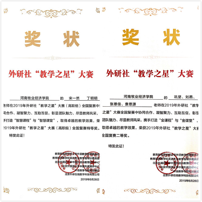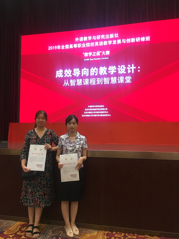 ok138cn太阳集团古天乐始终把锤炼教师教学基本技能,提升课堂教学质量作为工作重点,同时积极打造高素质、专业化、创新型金牌外语教师队伍。今年五月接到2019年外研社“外研之星”教学大赛通知之后,ok138cn太阳集团古天乐精心组织,通过我校的三级教学观摩课活动,选拔出三组教师团队分别参加高职组、大学英语组、英语类专业组组三个级别的比赛。参赛团队以OBE理念为主导,在教学设计上突出成效导向和智慧课堂在英语教学实践中所起到的融合、创新和引领作用,通过线上与线下融合、语言与专业融合、教学与产业融合的教学模式,实现对学生的语言能力、思维能力、学习能力的综合培养。在全国复赛阶段,我校以巩坚、刘燕、张思佳、袁思源组成的团队获得大学英语组二等奖,以温晶晶、禹琳琳、边洁英组成的团队获得英语类专业组二等奖,以宋一然、丁明明组成的团队获得高职组特等奖,并晋级全国半决赛。7月 25日,在苏州全国半决赛现场上,宋一然、丁明明分工协作,完成了课程设计阐释、教学展示、评委问答三个环节,荣获二等奖。