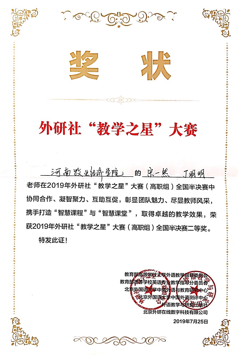 在我校暑期迎评促建磨课如火如荼进行之际,ok138cn太阳集团古天乐以宋一然、丁明明组成的教师团队在刚刚结束的2019年外研社“教学之星”大赛(高职组)全国半决赛中荣获二等奖的优异成绩,在全国赛场上彰显我校教师风采。