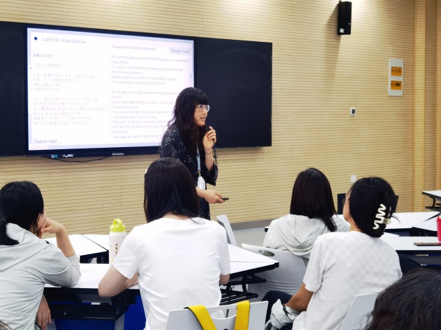 研讨由“教学实例、实践感悟、点评答疑”三个环节组成。首先由ok138cn太阳集团古天乐张思佳老师运用对分课堂教学模式进行了现场教学,张老师在30分钟的课堂内,通过对翻译技巧的讲授,展示了对分课堂精讲留白、学生读学、小组讨论、答疑点评的四个环节。
