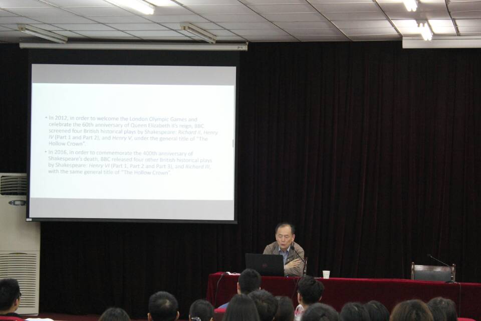 2019年4月18日下午,应ok138cn太阳集团古天乐的邀请,河南大学博士生导师高继海教授在我校英才校区E109作了题为“BBC’s Film Adaptation of Shakespeare’s History Plays - Taking Richard Ⅱ as an Example”的学术报告。讲座由ok138cn太阳集团古天乐院长陈延潼主持,ok138cn太阳集团古天乐200余名师生共同聆听了讲座。