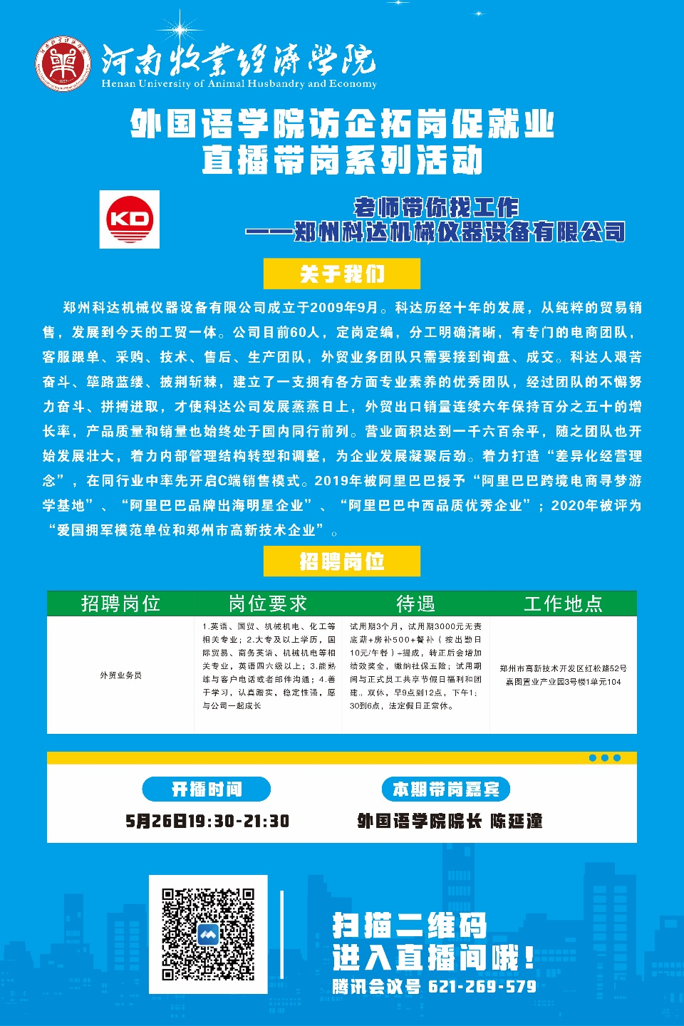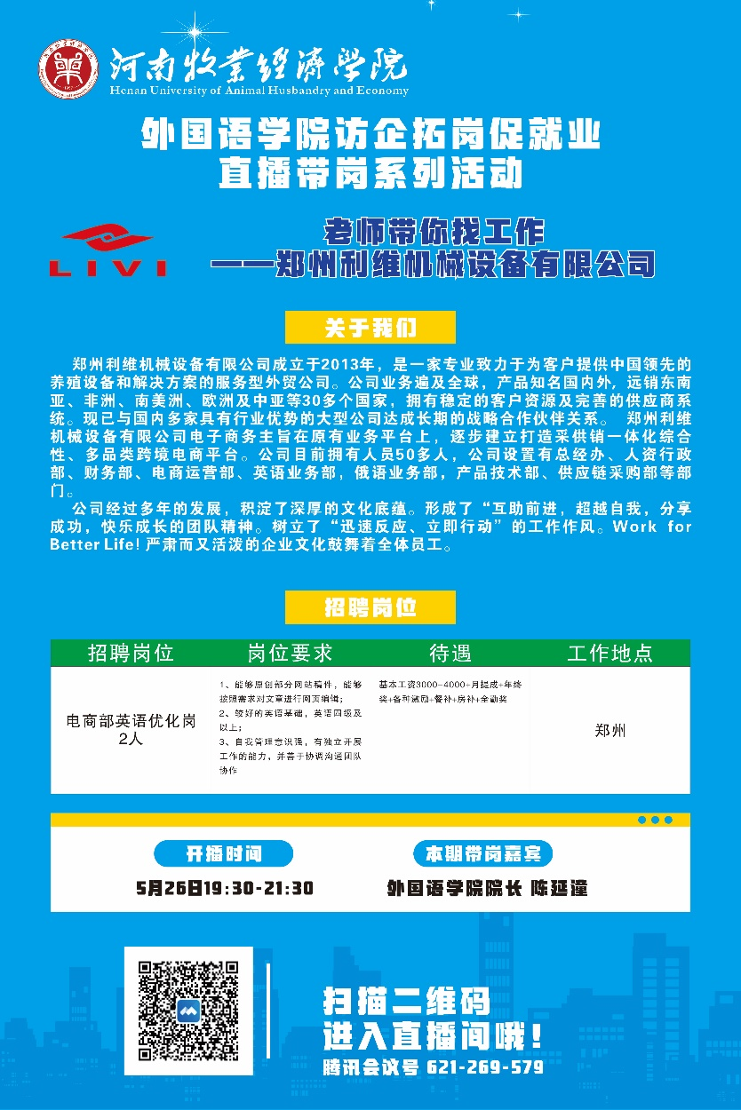 5月26日晚,ok138cn太阳集团古天乐首场商务英语专业直播带岗专场招聘会顺利举办,本次直播带岗由ok138cn太阳集团古天乐院长陈延潼主持,河南海恒国际贸易集团有限公司、郑州利维机械设备有限公司、郑州科达机械仪器设备有限公司三家企业应邀进入直播间,通过直播间互动交流,针对广大毕业生关心的企业概况、招聘岗位、薪资福利、工作地点、岗位需求、发展前景等问题进行宣讲,并现场连线作答,与毕业生进行热烈的交流互动,并对有意向的毕业生进行了初步的线上面试。