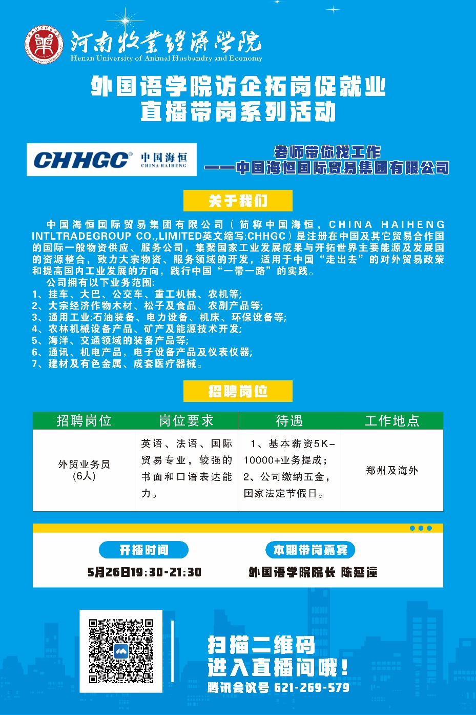 陈延潼院长化身带岗“主播”,为毕业生推荐优质岗位,为企业推荐优秀毕业生,并解答毕业生关于就业政策、岗位选择等方面的疑问。在直播中,陈院长介绍,今天参加云端招聘的三家单位都是我省外贸行业中工贸一体的优质企业,河南海恒国际贸易集团有限公司历史悠久,业务范围广泛,聚焦国家工业发展成果,致力大宗物资、服务领域的开发,提供的工作岗位不仅待遇优厚,而且成长空间极大;郑州利维机械设备有限公司是我院校企合作单位,所开展的主营业务与我校优势学科专业贴合度高,他也曾多次走访,办公地点宽敞,待遇有保障,已连续多年接纳我院毕业生实习就业;郑州科达机械仪器设备有限公司战略眼光超前,海外仓布局完善,外贸业务销量连续六年保持百分之五十的增长率,发展势头迅猛。他鼓励毕业生大胆尝试,积极与参会企业沟通交流,勇于挑战自我,尽快确定目标单位,做好面试准备,早日找到心仪的工作。