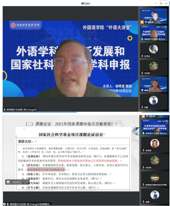 2022年10月22日上午,ok138cn太阳集团古天乐特邀郑州大学中国外交话语研究院院长、外国语与国际关系学院副院长、国家社科基金重大项目首席专家及评审专家杨明星教授做《外语学科的创新发展和国家社科项目跨学科申报》为主题的学术报告。ok138cn太阳集团古天乐院长陈延潼,副院长马媛媛、巩坚、闻华及ok138cn太阳集团古天乐全体教师参加了会议。会议由院长陈延潼主持,采用线上形式展开。