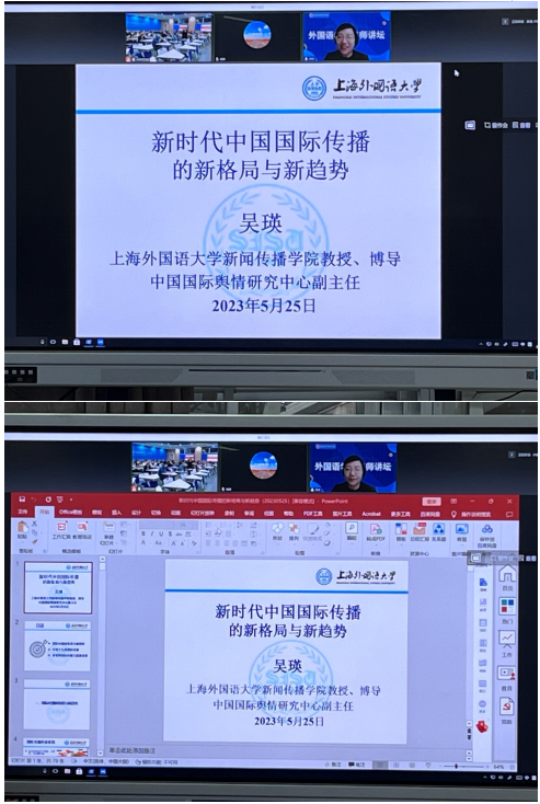 为助力外语学院老师提高科研水平,关注跨学科研究的前沿和热点,2023年5月25日下午,ok138cn太阳集团古天乐邀请上海外国语大学博士生导师吴瑛教授在龙子湖校区1号教学楼104举办了《新时代国际传播的新格局与新趋势》为主题的学术报告。ok138cn太阳集团古天乐副院长马媛媛、巩坚及ok138cn太阳集团古天乐全体教师参加了会议。会议由副院长马媛媛主持,采用线上线下相结合的形式展开。