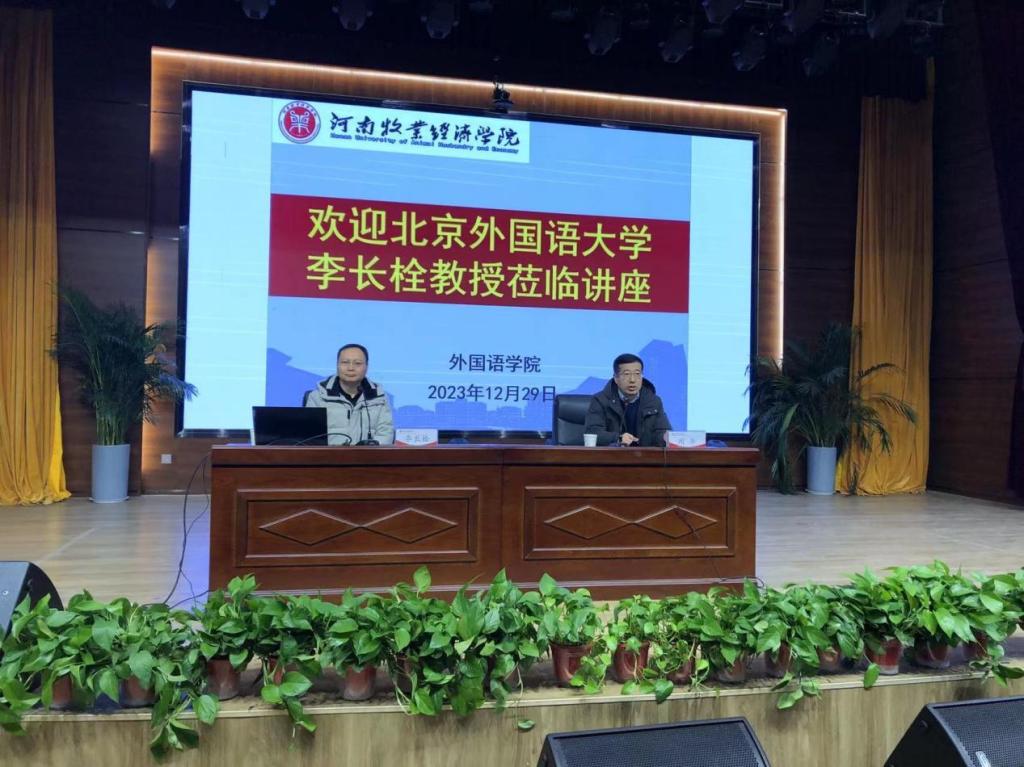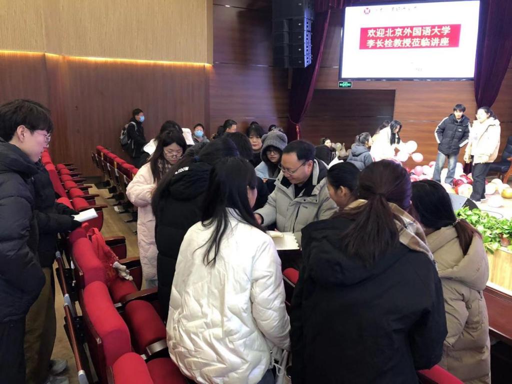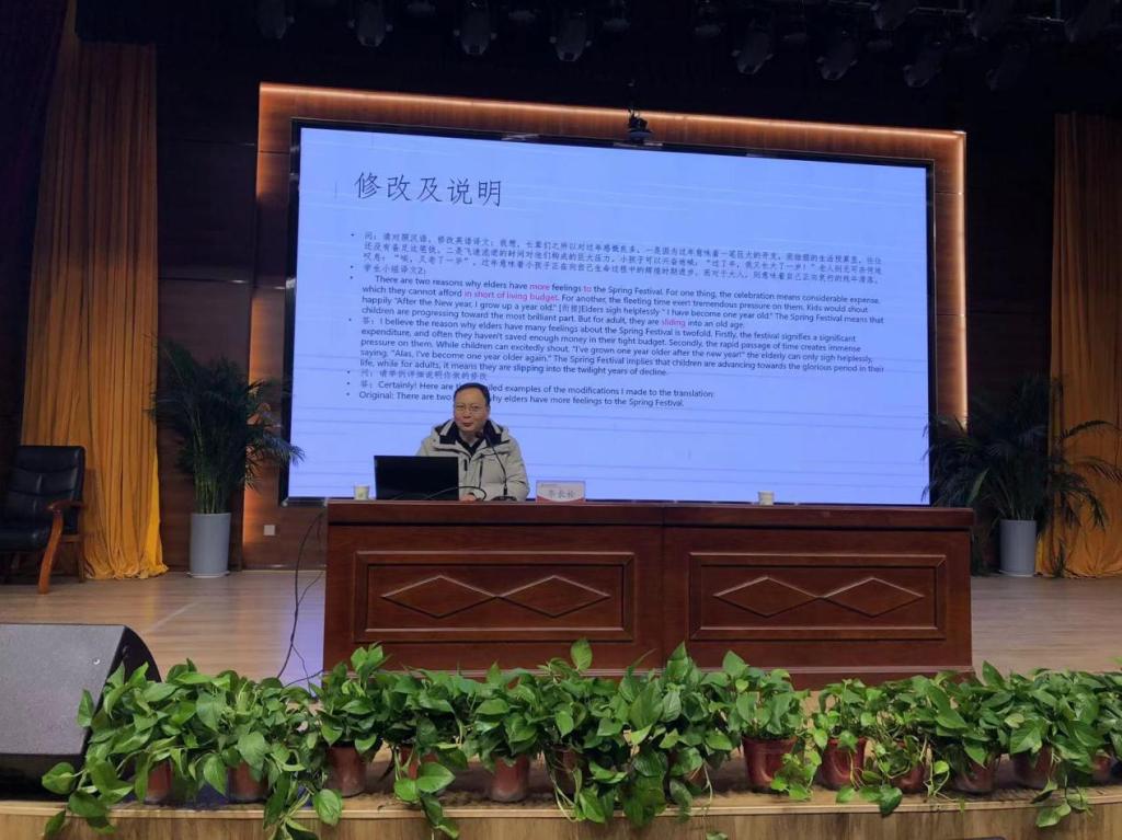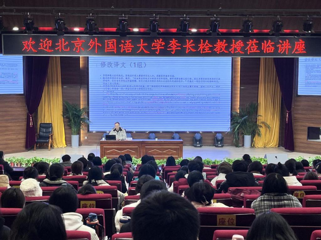 助力ok138cn太阳集团古天乐教师提高科研水平,帮助外语专业学生提升翻译能力,2023年12月29日上午,ok138cn太阳集团古天乐邀请北京外国语大学高级翻译学院副院长李长栓教授在龙子湖校区1号教学楼合100报告厅举办了以《人工智能背景下的翻译实践》为主题的学术报告。ok138cn太阳集团古天乐院长陈延潼、副院长闻华,ok138cn太阳集团古天乐部分教师及学生参加会议。会议由副院长闻华主持。