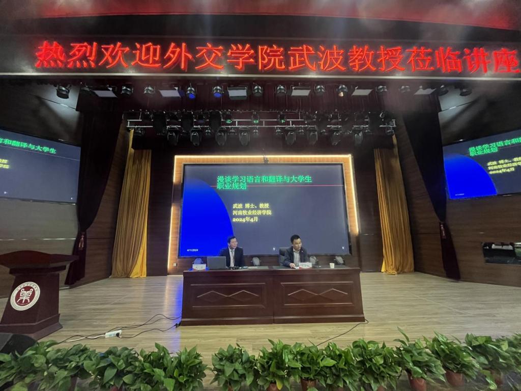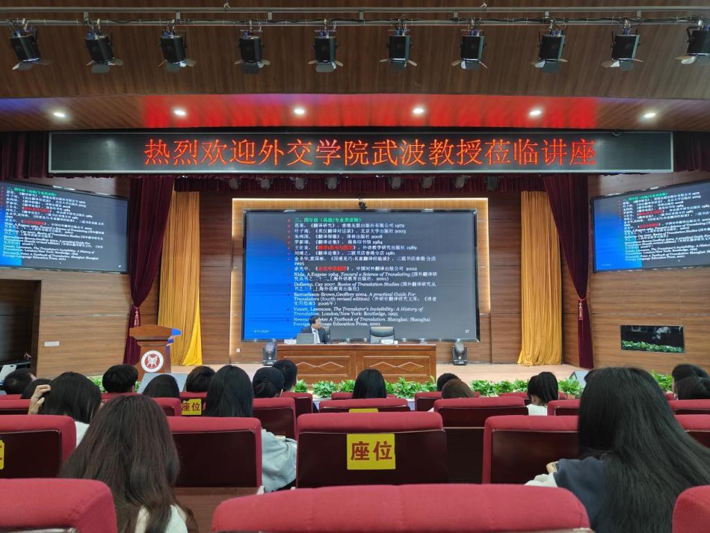 为助力ok138cn太阳集团古天乐老师提高科研水平,帮助外语专业学生提升翻译能力,引导大学生更好地规划自己的职业道路,2024年4月11日ok138cn太阳集团古天乐邀请外交学院武波教授在龙子湖校区1号教学楼合100报告厅举办了主题为《漫谈学习语言和翻译与大学生职业规划》的讲座。ok138cn太阳集团古天乐院长陈延潼、副院长闻华,ok138cn太阳集团古天乐部分教师及学生参加了会议。会议由副院长闻华主持。