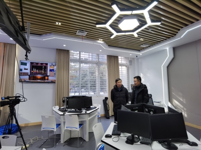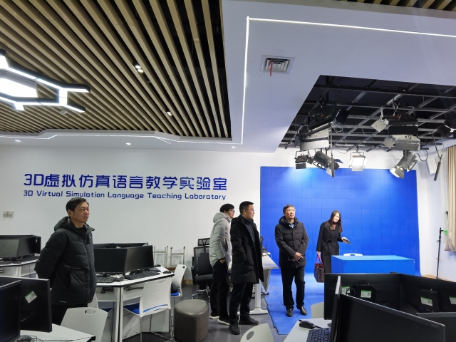 随后与会人员参观了我校虚拟仿真语言学习中心,郑珏演示了智能教学平台的操作方式,带领大家实景体验了我校英语口语智慧实验室、3D虚拟仿真语言教学实验室的各项功能,随后双方就实验室建设、使用与维护以及依托智能云平台所取得的教育教学改革成果、发现的问题以及解决的途径等具体问题进行了热烈的探讨和交流。
