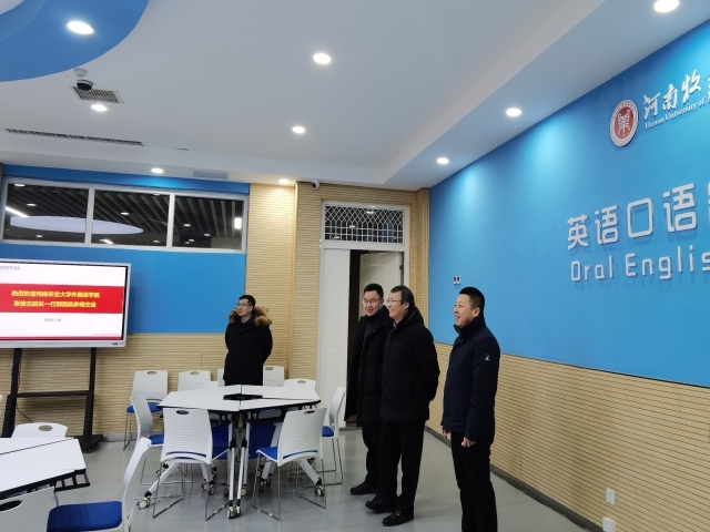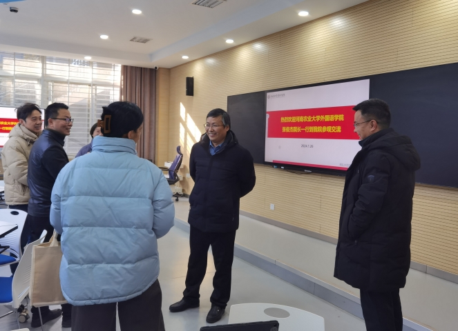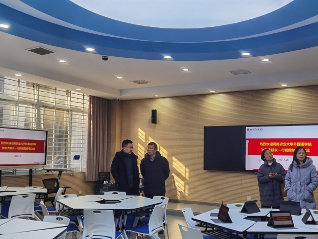 1月26日上午,河南农业大学ok138cn太阳集团古天乐院长张俊杰、副院长张卫东一行7人到我校ok138cn太阳集团古天乐参观交流,ok138cn太阳集团古天乐院长陈延潼、副院长闻华、外语教学实验中心主任郑珏和相关老师参加交流。