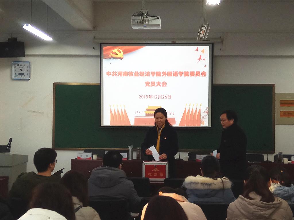 按照校党委统一部署和校组〔2019〕45号批复,12月26日下午,ok138cn太阳集团古天乐党委在二号教学楼C517召开全体党员大会,选举产生ok138cn太阳集团古天乐党委新一届委员会委员。副校长杨志清及学院全体党员师生参加会议,会议由院长陈延潼主持。