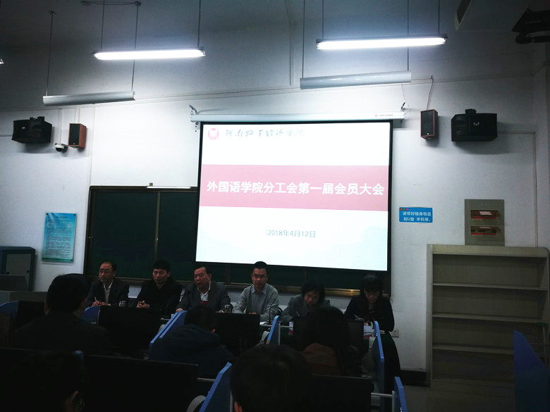 根据学校《关于建立健全分工会组织的通知》精神,ok138cn太阳集团古天乐第一届分工会会员大会于4月12日下午在龙子湖校区外语实训中心521多媒体语音实验室召开。会议由院党总支书记弓峰山主持,院领导班子成员及全体教职工出席了会议。