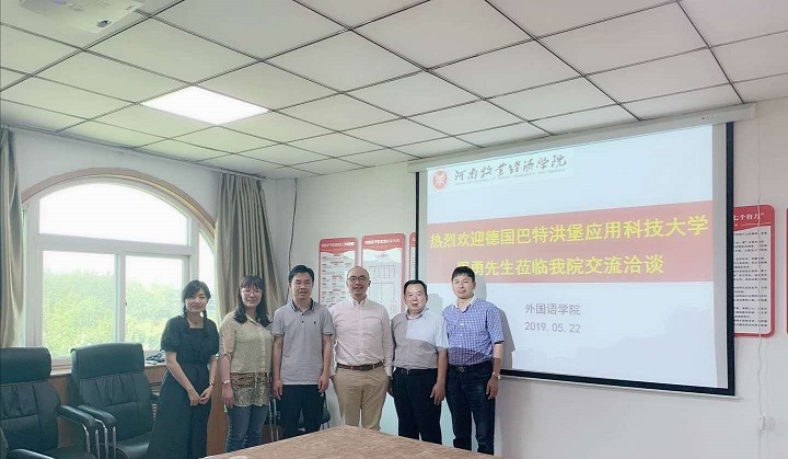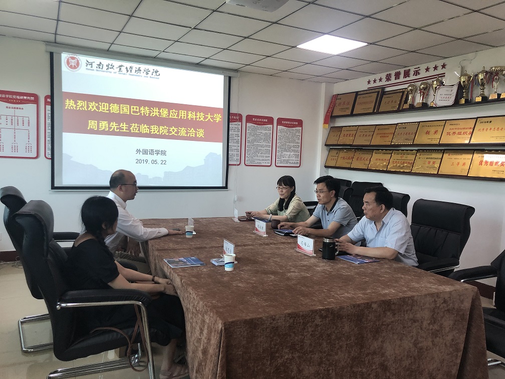 ok138cn太阳集团古天乐院长陈延潼对周勇先生的到访表示了热烈欢迎,向客人详细介绍了我校和我院的基本情况,希望能通过校际间的交流互动,本着促进双方学校发展、促进学生成才的目标,找到合作切入点,以点带面,加强合作的深度和持久度,早日结出丰硕成果。周勇先生对我院的热情接待表示感谢,介绍了德国巴特洪堡应用科技大学的基本情况以及与国内其他高校的合作情况,提出该校以培养应用型人才为目标,有与国内应用型学校深入合作的愿望;该校本科阶段以徳语、英语为教学语言,硕士、博士阶段以英语为教学语言,国际留学生与德国本土学生混班编制,有利于学生增强英语、德语语言能力,加强文化交流互鉴;周勇先生希望与我院建立长期友好合作关系。双方就“四+二”本硕连读合作办学模式,本科交换生项目、暑期游学,师资培训、科研合作等进行了深入的交流探讨。