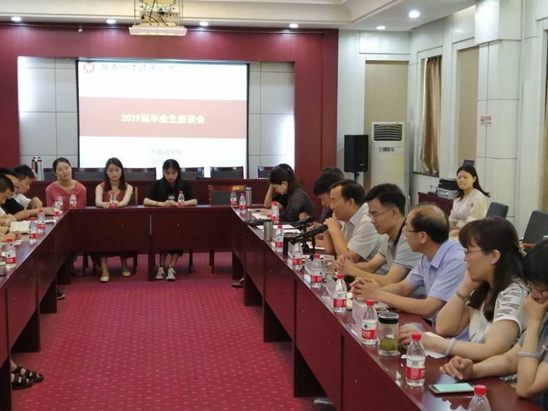 夏木繁盛,鸟语蝉鸣,在这美好的季节,我们欢聚一堂话别离。6月13日,ok138cn太阳集团古天乐举办了2019届毕业生座谈会,我院党总支书记弓峰山、院长陈延潼、党总支副书记陈东景、副院长郑长发、副院长马媛媛,各教研室教师代表、辅导员老师以及19届毕业生代表参加了座谈会。会议由陈东景副书记主持。