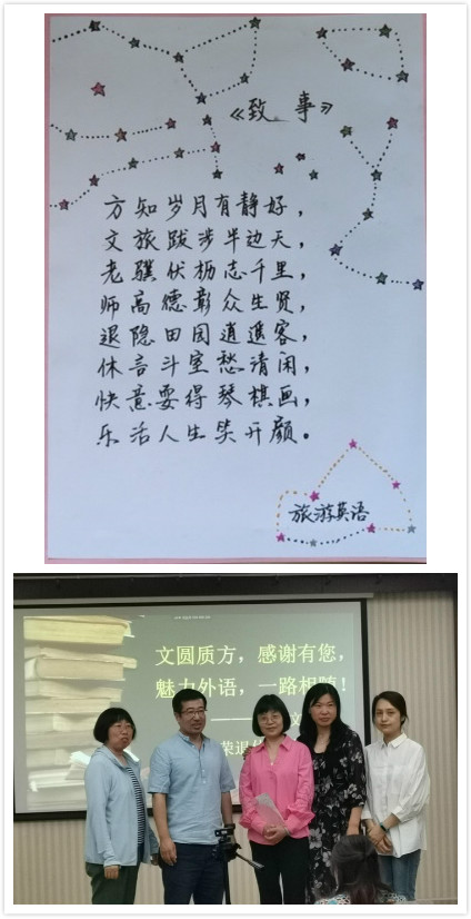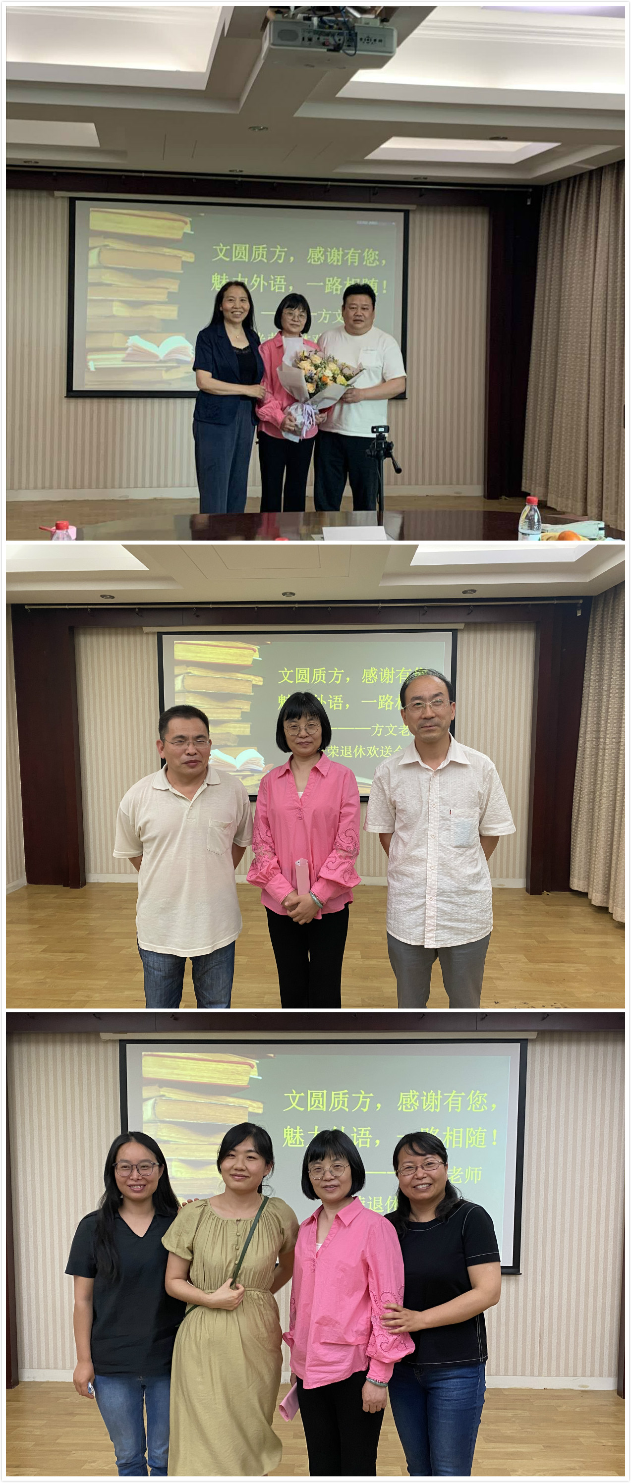 副院长许海兰、马媛媛向方老师送上了全体教工的一份心意;教师代表曹军亮向自己的老同学、老同事献上了鲜花;旅游英语教研室主任闻华向方老师献上教研室所有老师精心制作的贺卡,并朗诵了为方老师荣休所作的诗歌。