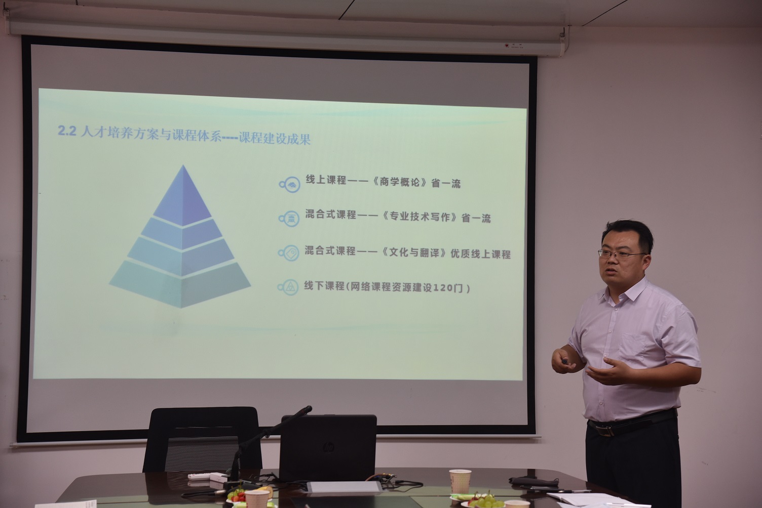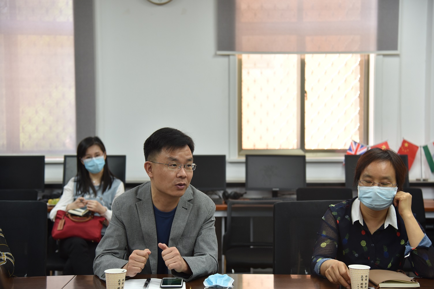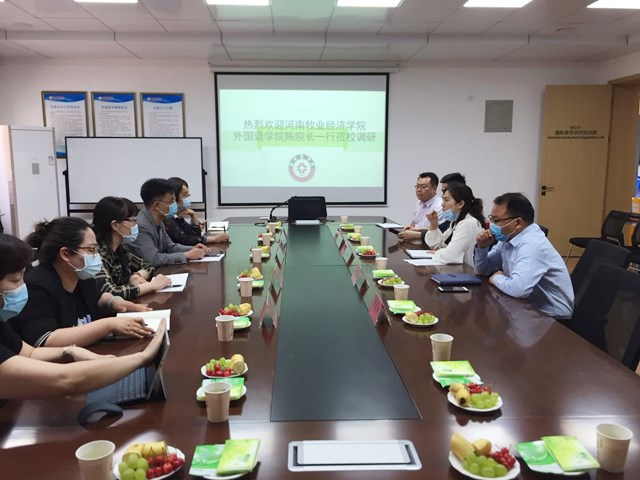 在会议交流中,陈院长对郑州商学院ok138cn太阳集团古天乐的热情接待表示感谢,介绍了我院以“根扎外国语,花开牧工商”为己任,培养“精外语、通商务”的高水平复合应用型“语言+”人才的办学理念,并就迎接本科合格评估、学位评估、首届本科毕业论文指导工作的情况进行了交流。王勃院长就郑州商学院外语学院发展概况、学科建设、师资队伍建设、人才培养方案制定等进行了详细阐述,重点介绍了该院商务英语专业作为2019年度“河南省一流本科专业建设点”的总体概况、本科生毕业论文指导工作的开展及商务英语专业人才培养情况。针对商务英语本科专业建设,郑州商学院ok138cn太阳集团古天乐商务英语教研室主任赵宝成从“省级一流本科专业建设点”立项申报、课程建设、问题与展望等方面进行了详细解读。此外,双方对商务英语专业发展前景、应用型人才培养、“双师双能型”师资队伍建设、本科生毕业论文的选题及论文指导等工作进行了广泛、深入的探讨,一致表示应在推动专业发展、提高人才培养质量上形成合力,使学生具体扎实的理论功底、丰富的实践经验,为服务区域经济社会发展作出应有的贡献。