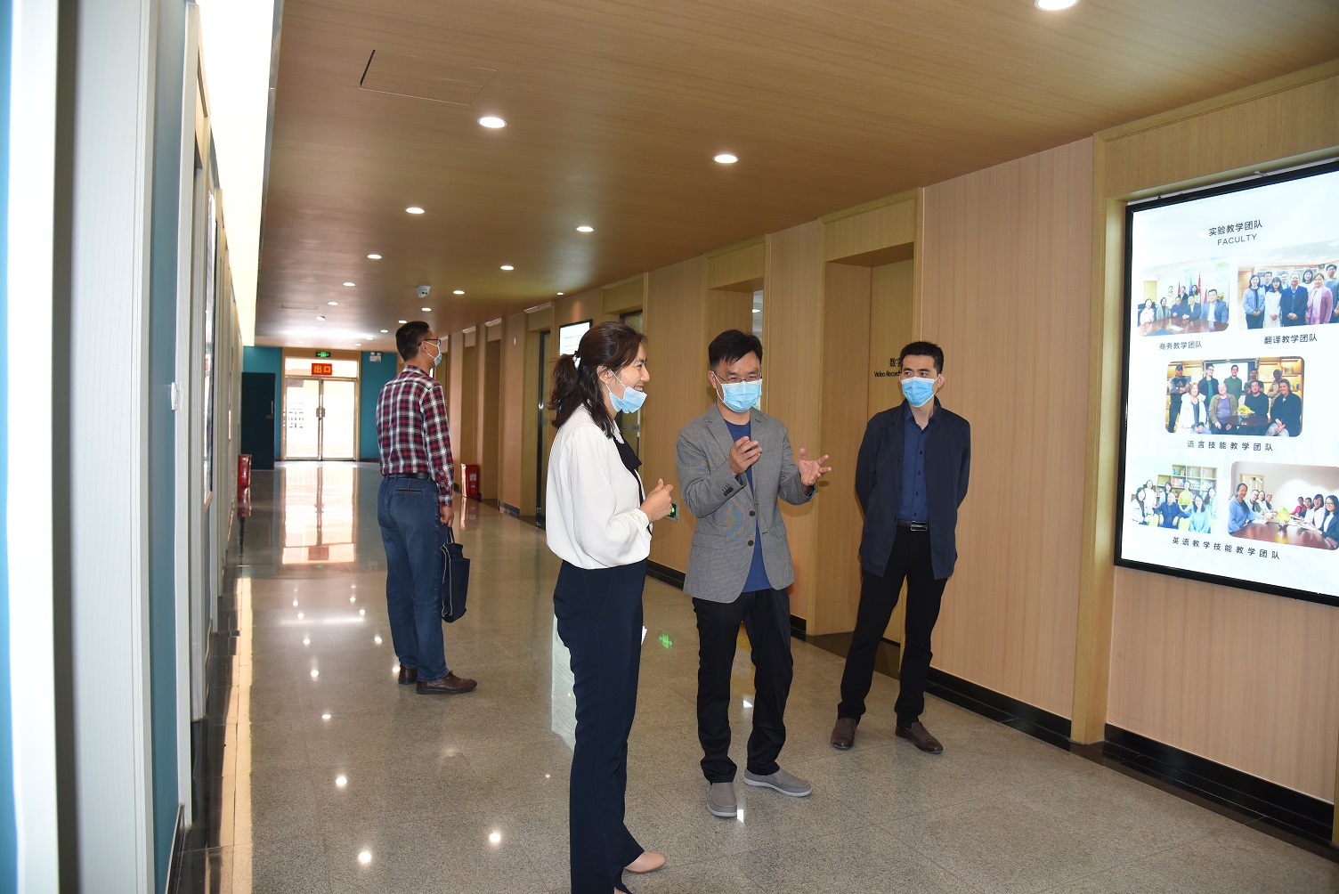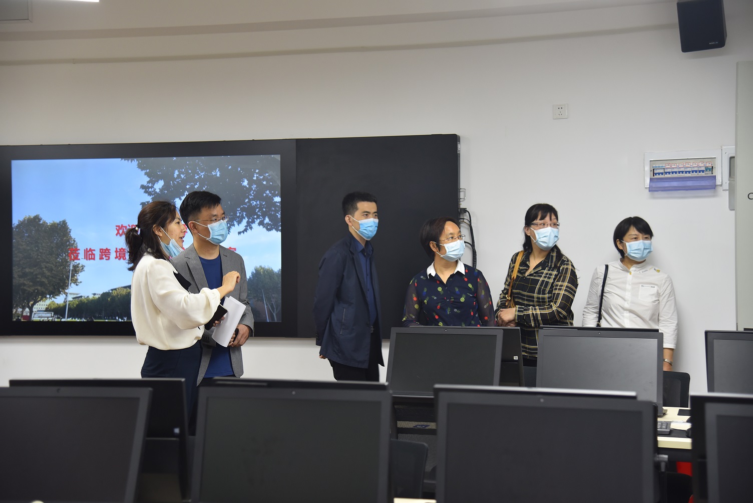 郑州商学院ok138cn太阳集团古天乐书记王克志、院长王勃对我院调研组的到来表示热烈欢迎,并带领大家参观了ok138cn太阳集团古天乐实验实践教学中心,重点介绍了跨境电商实训实验室、国际商务谈判实验室、数字化录播教室等实验室的建设情况。