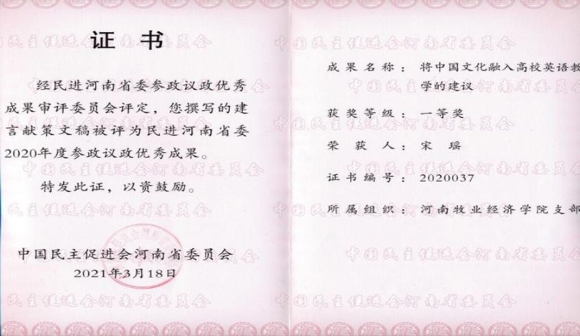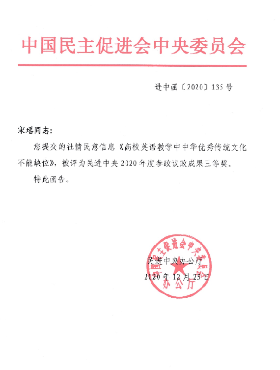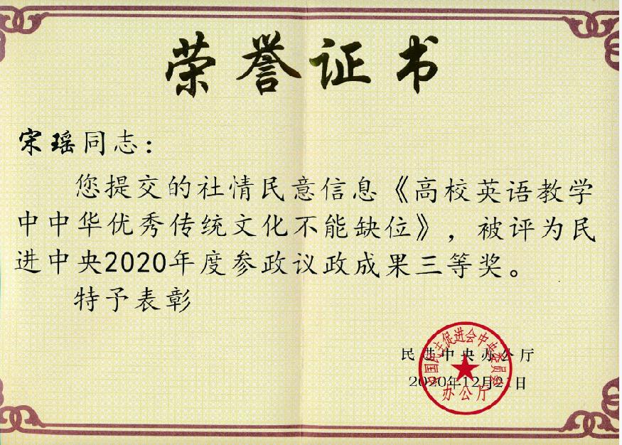 我校ok138cn太阳集团古天乐教师宋瑶老师提交的社情民意信息《高校英语教学中中华优秀传统文化不能缺位》,喜获民进中央2020年度参政议政成果三等奖,宋瑶老师在此基础上撰写的建言献策文稿《将中国文化融入高校英语教学的建议》被评为民进河南省委2020年度参政议政优秀成果一等奖。