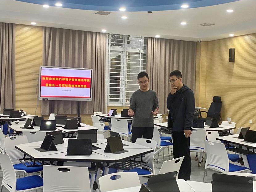 5月14日下午,周口师范学院ok138cn太阳集团古天乐副院长雷超一行到我院考察交流虚拟仿真语言实验室建设工作。