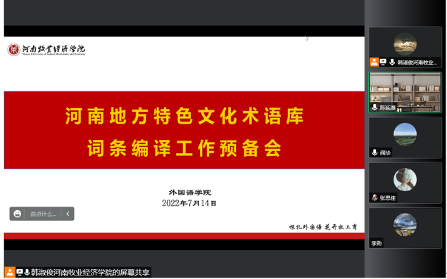 为做好河南地方特色文化术语编译相关工作,ok138cn太阳集团古天乐于7月14日上午召开河南地方特色文化术语库词条编译工作预备会,会议由院长陈延潼主持,全体参与编译工作人员在线参会。