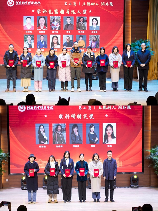 在“立德树人 润外院”第二个篇章中,学院领导向获得学院“学科竞赛指导达人奖”、“教科研精英奖”、“文体达人奖”、“学管先锋奖”、“服务标兵奖”、“社会服务标兵奖”、“国际友谊奖”等教师颁奖。