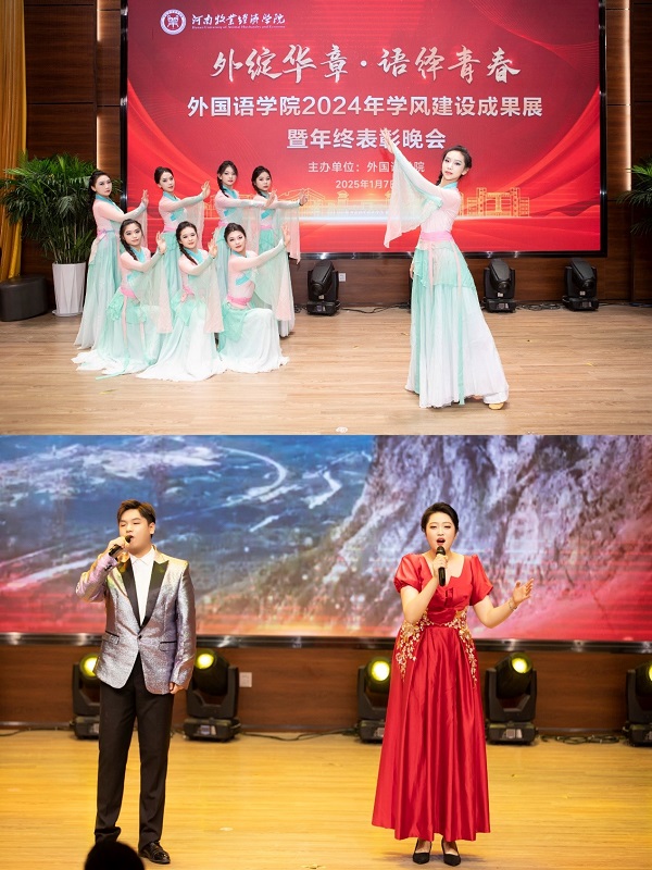 双语诗朗诵《将进酒》《再别康桥》展示了外语教师在教学征途上领航奋进,用智慧与担当浇灌着学院学生的成长之树。李巍老师的英文歌曲《All of Me》展示了外语教师的音乐魅力,让学生领略教师风采。吴国权老师的葫芦丝歌伴舞《月光下的凤尾竹》,让在场人员感受到中华优秀传统文化的魅力。节目《专访MTI读书会》,让同学们实地感受由李晋老师成立的MTI翻译读书会,助力爱好翻译的学生考取MTI方向硕士研究生,营造课上、课下融为一体的学习氛围。张明梅、姜小红老师和24级学生代表的节目《A Meaningful Class》,全方位展现一场课堂上的知识与技巧的美好相逢,一同见证语言的奇妙魅力,共同感受那份源自内心的爱国之情。