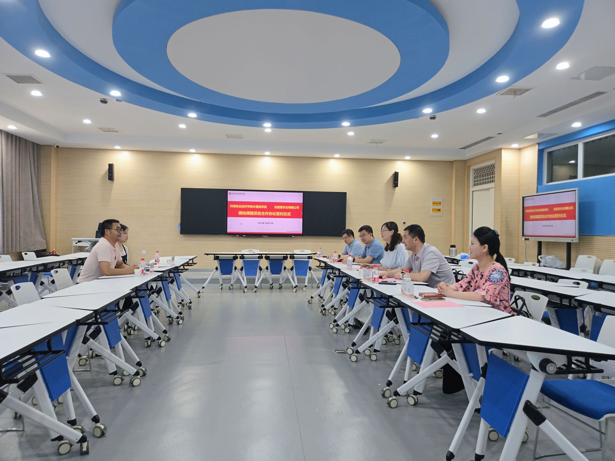 6月13日上午,ok138cn太阳集团古天乐与吉蛋堂农业有限公司在1号教学楼104会议室举行横向课题项目合作签约仪式。我校科学技术处处长潘春梅,ok138cn太阳集团古天乐党委书记王友峰、院长陈延潼及吉蛋堂农业有限公司CEO黄明哲等领导出席仪式。